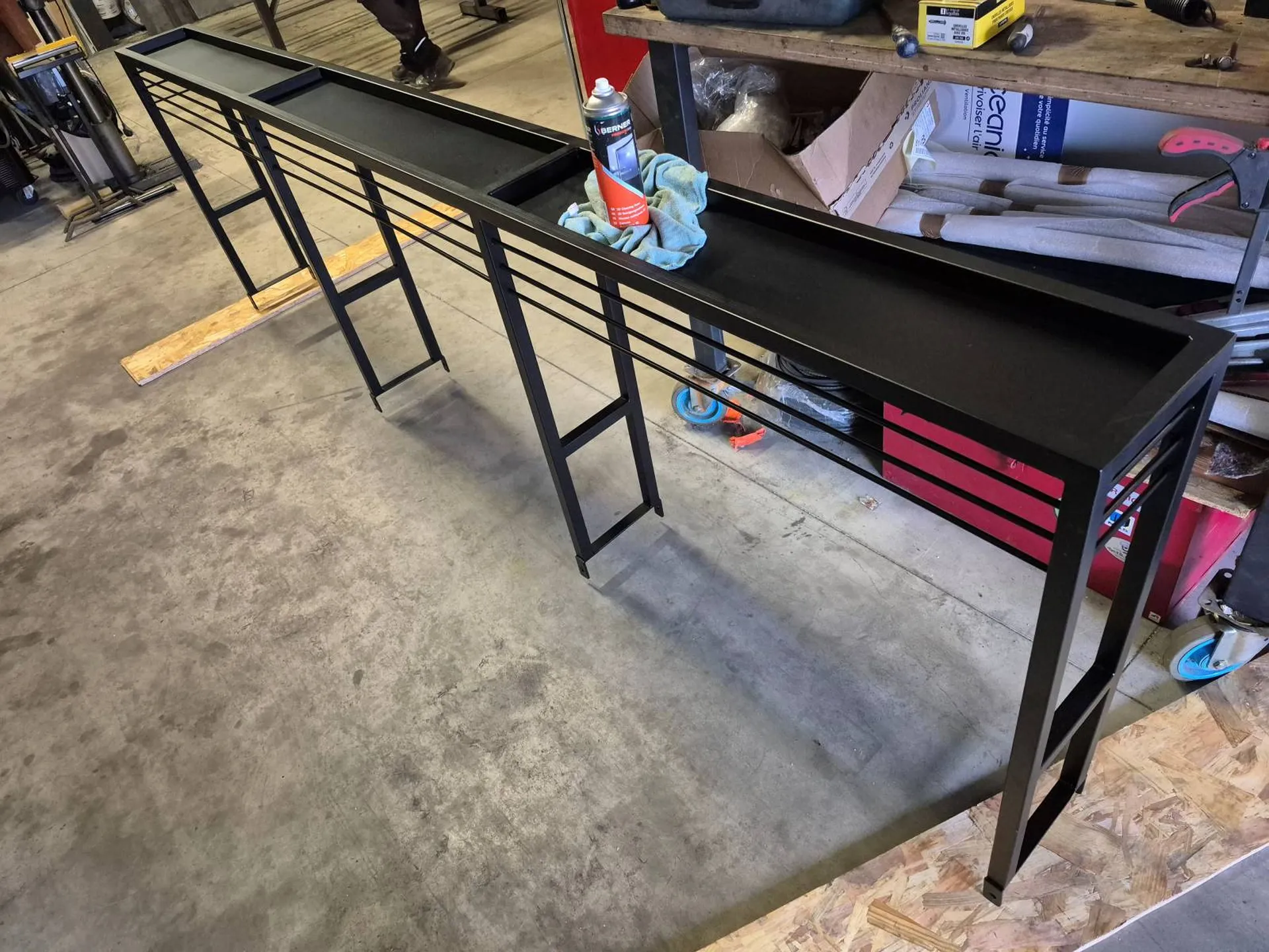 L’ensemble de la structure a bénéficié d’une finition par thermolaquage, dans une teinte définie en amont, assurant une excellente durabilité et une parfaite intégration esthétique. En partie haute, des encadrements métalliques sur mesure ont été réalisés et complétés par un remplissage en plaques de plâtre coupe-feu BA13, classées A2 S1 D0, répondant aux exigences réglementaires des établissements recevant du public.
