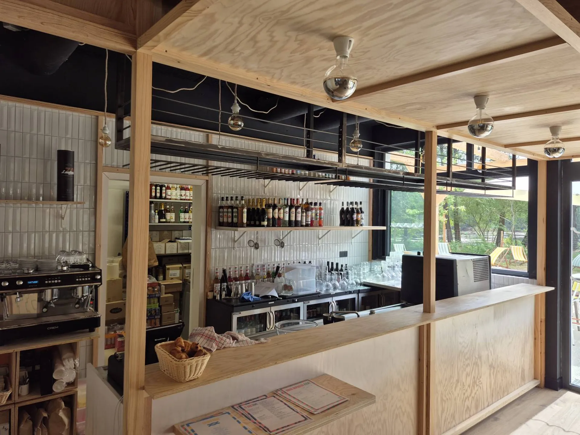 En atelier, nos équipes ont ensuite fabriqué un ciel de bar tubulaire en acier conférant à l’ensemble une allure légère et structurée. La finition a été traitée avec une peinture anti-rouille, préservant l’aspect brut de l’acier tout en assurant sa durabilité.