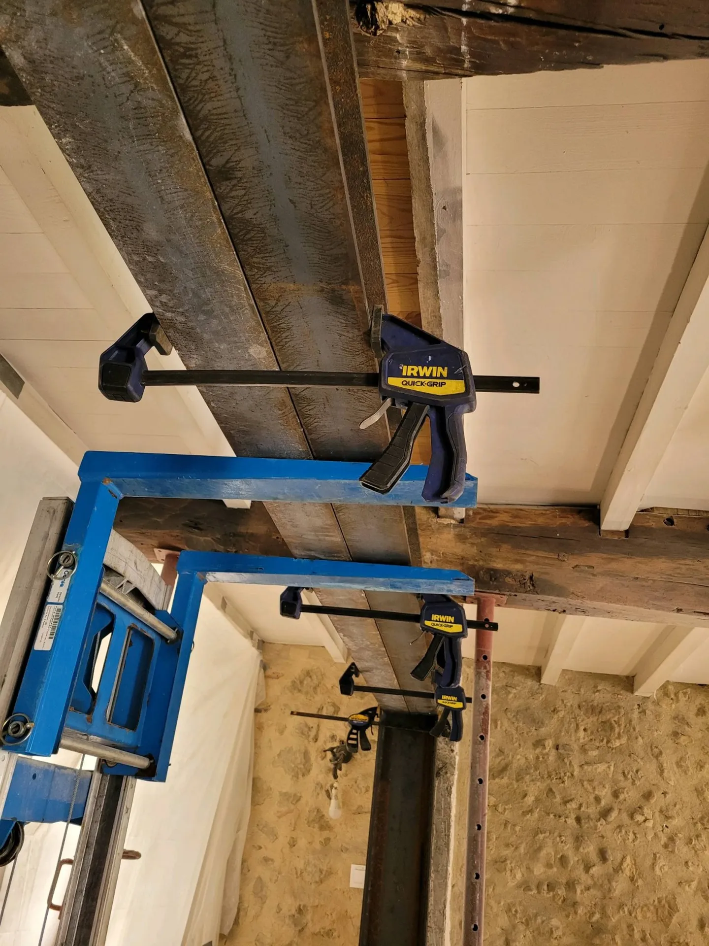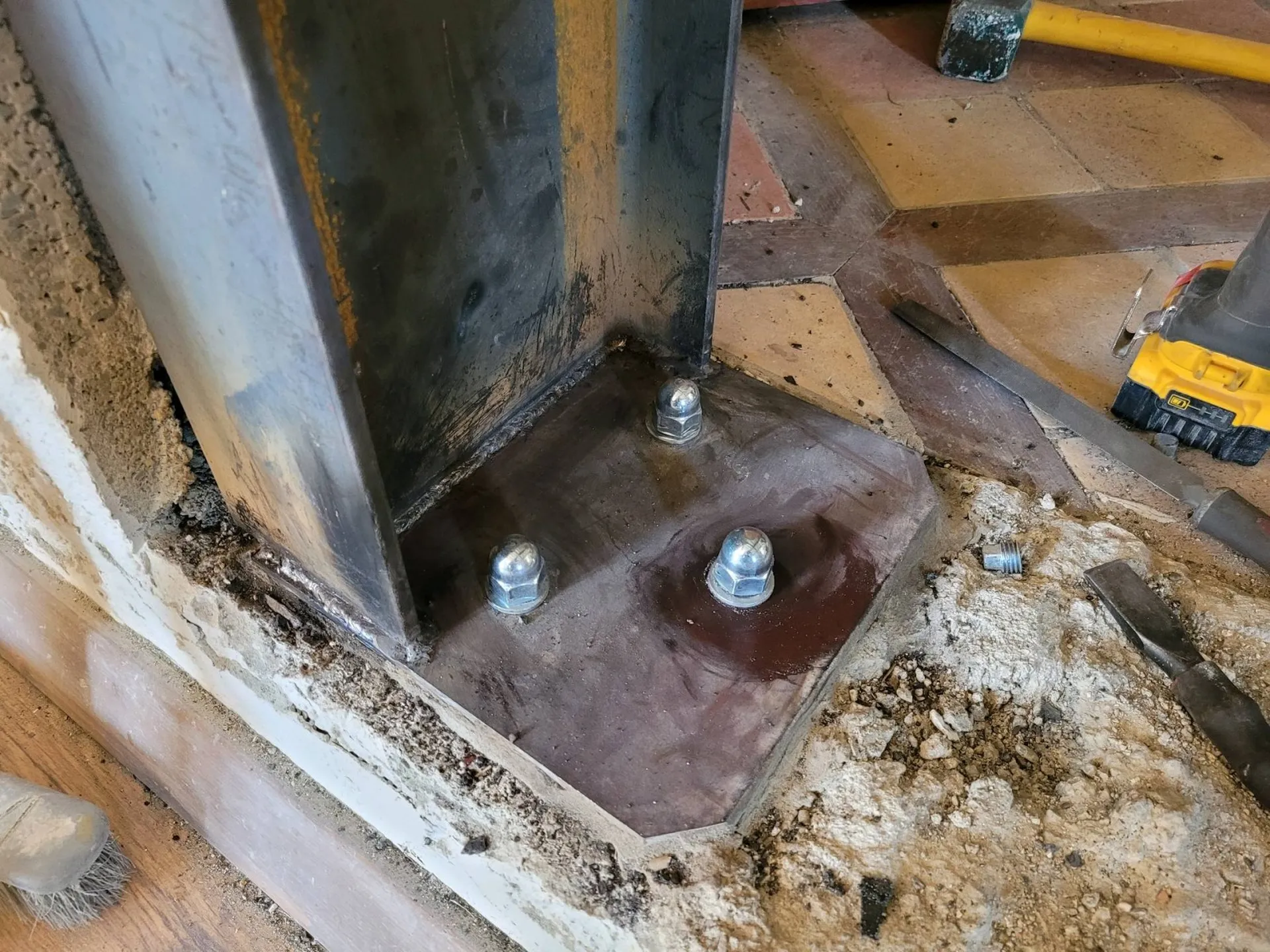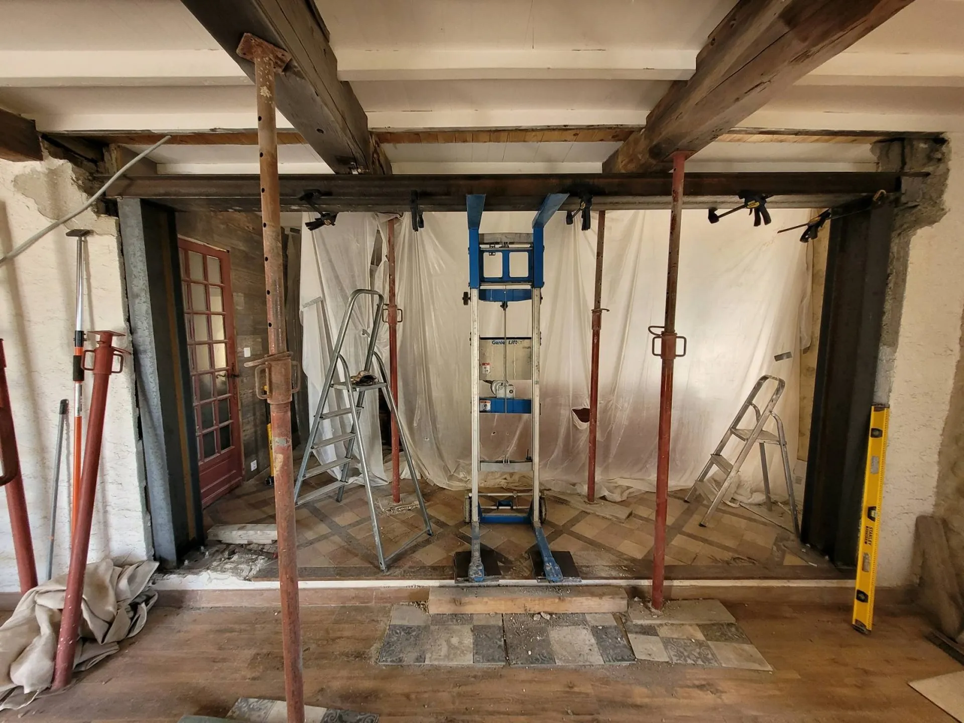 Une fois les calculs terminés avec une prise de cotes précise, nous avons soumis le devis au client. Après le devis accepté, nous avons procédé à la découpe et à l'étayage du mur avec notre entreprise de maçonnerie partenaire. La découpe terminée, nous avons installé la structure métallique au sein du mur porteur permettant de tenir l'ensemble de l'étage de la maison.