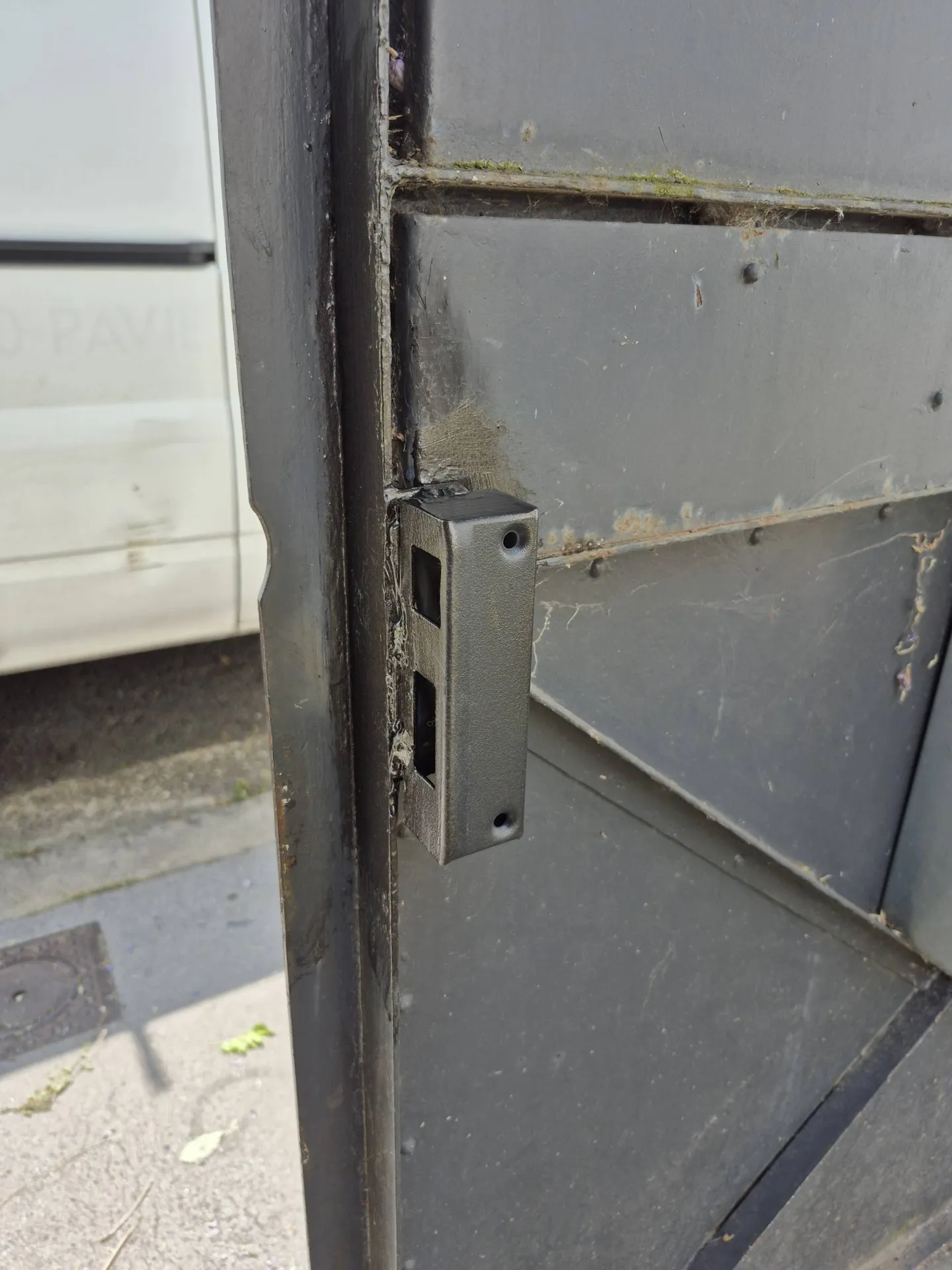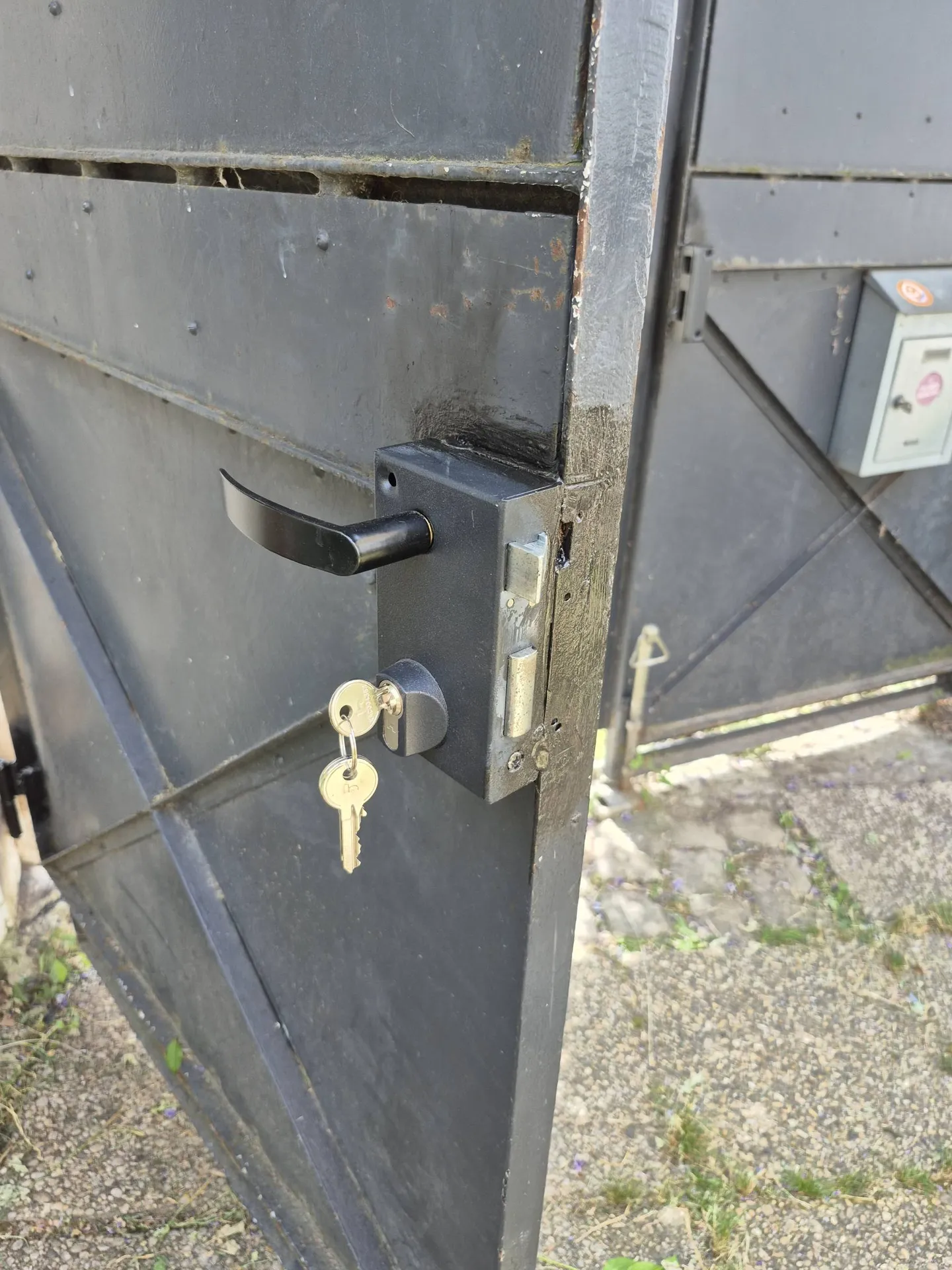 Pose d’un nouveau bloc serrure avec cylindre européen et béquille double, améliorant la sécurité sans altérer l’aspect du portail