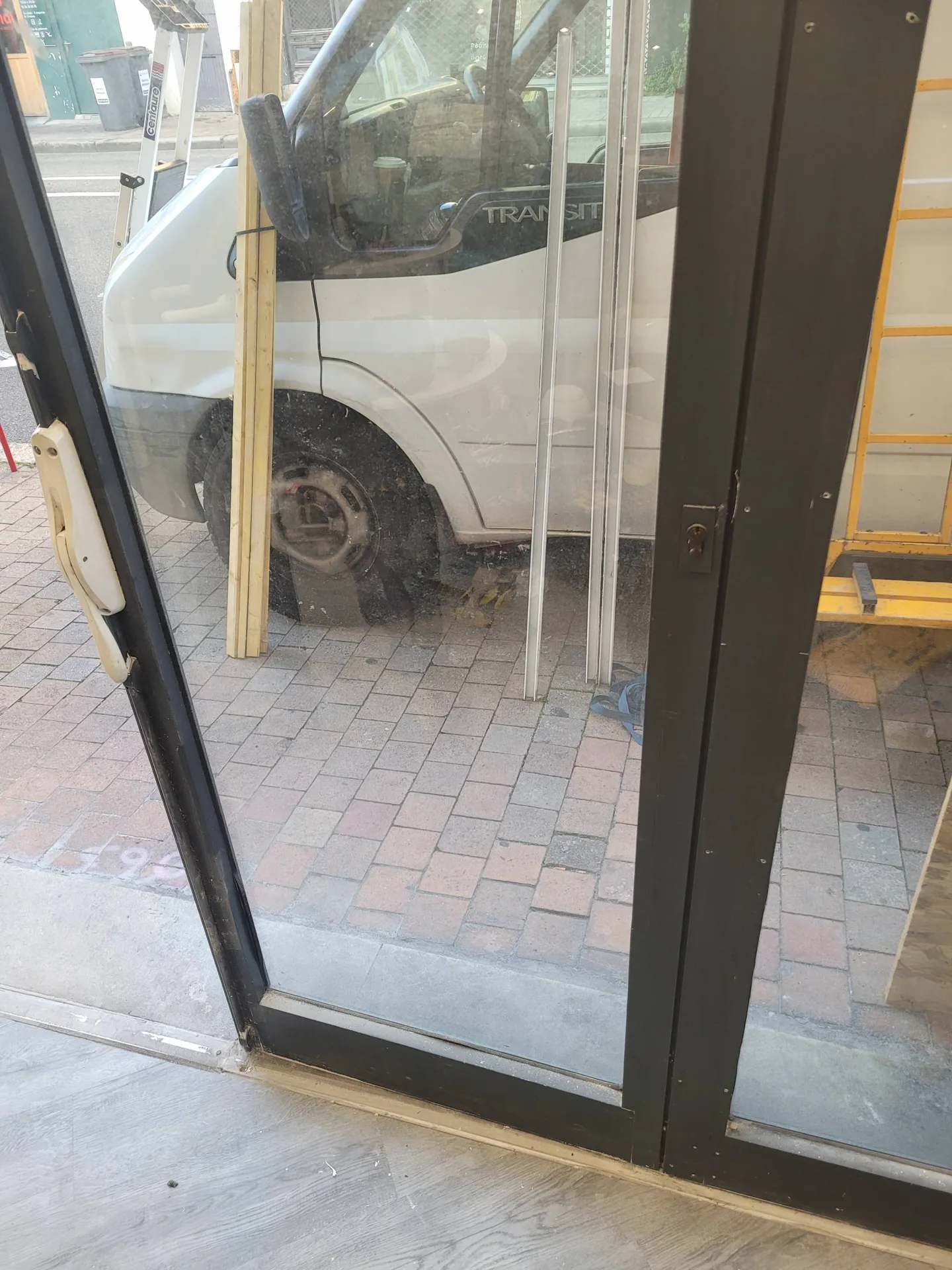 L’intervention a commencé par la dépose et l’évacuation de la vitrine existante, afin de préparer l’espace pour la nouvelle installation. Nous avons ensuite fabriqué une nouvelle vitrine de la gamme Profil Système, composée de deux châssis fixes, une porte et un imposte, avec une finition thermolaquée pour garantir esthétique et durabilité.